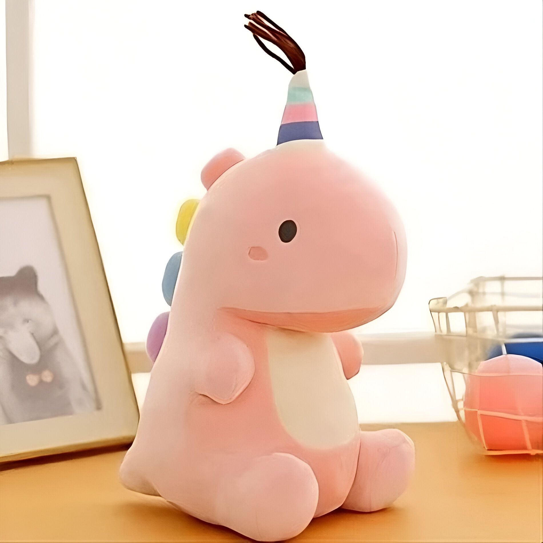 Une peluche rose en forme de dinosaure avec un chapeau arc-en-ciel sur la tête. Elle est assise sur une table en bois.