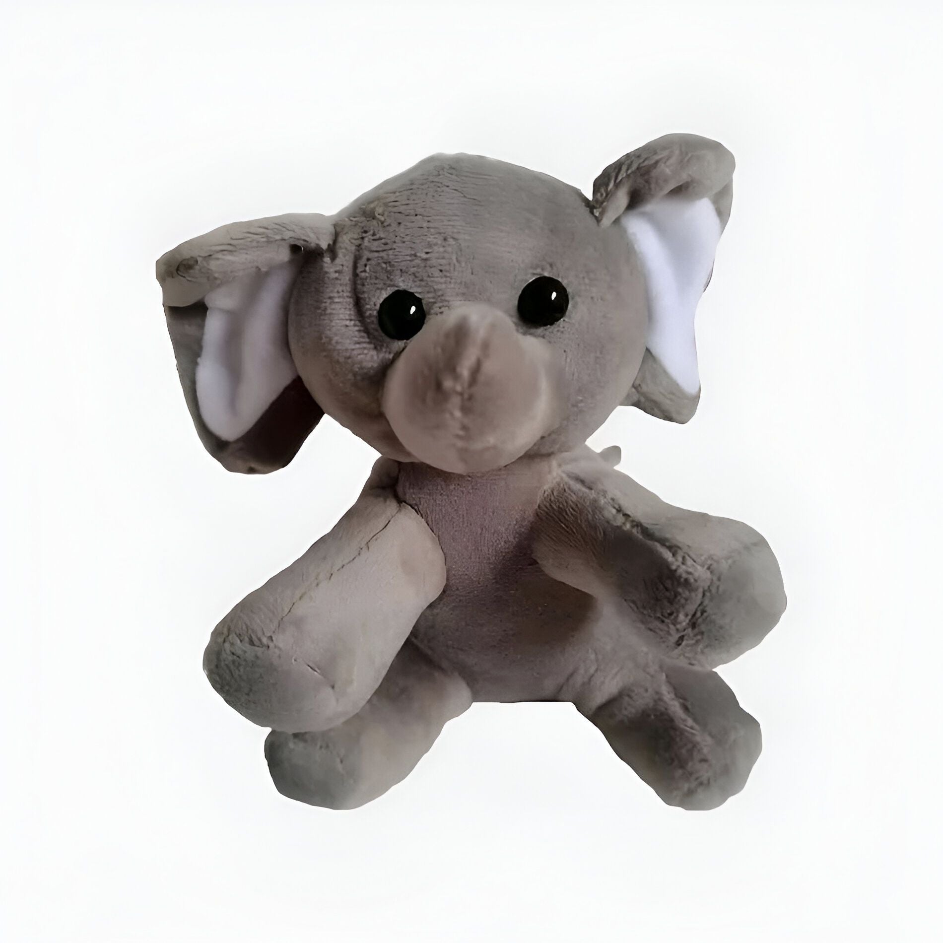 Jolie peluche d'éléphant gris avec de grandes oreilles blanches et des yeux noirs.